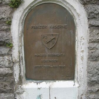 Gedenktafel an der Mauer der Panzerkaserne; erinnert an den Einzug des Regiments Nr. 8 am 1.4.1938. 1965 gestiftet von der US Army als Ersatz für die urspr. Tafel, die 1945 zerstört worden war. Bronzetafel mit halbrundem Abschluss, Wappen des Regiments und Inschrift. Gut erhalten, 110cm hoch, 67cm breit.
