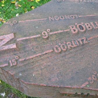 Sonnenuhr auf einem Stein aus Granit, auf dem Himmelsrichtungen, Grade und Orte angegeben sind. Steinplatte auf Sockel liegt auf dem 9. Längengrad östlich von Greenwich, von Hugo Krautter (Steinmetz), 1979 mit Inschrift. Gut erhalten, aber Schattenstab der Uhr fehlt, 285cm lang, 126cm breit, 30cm hoch.