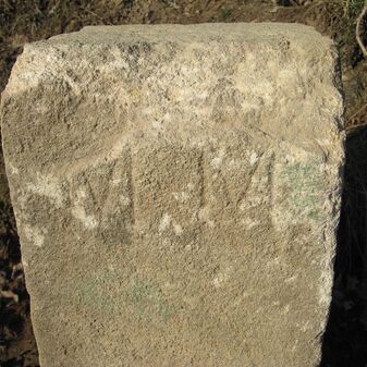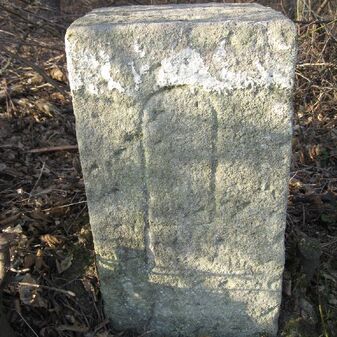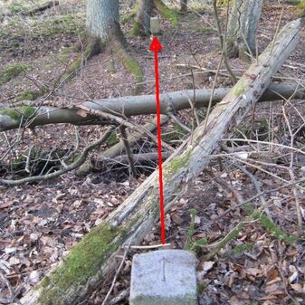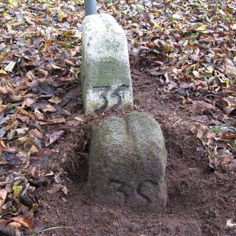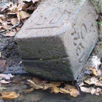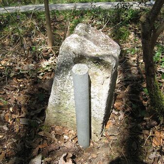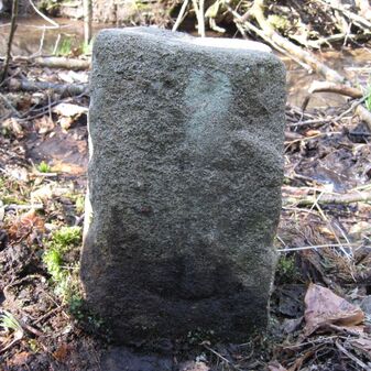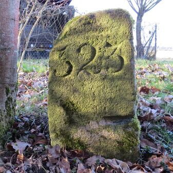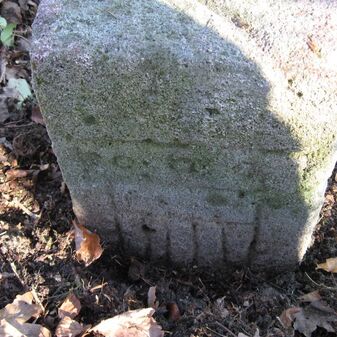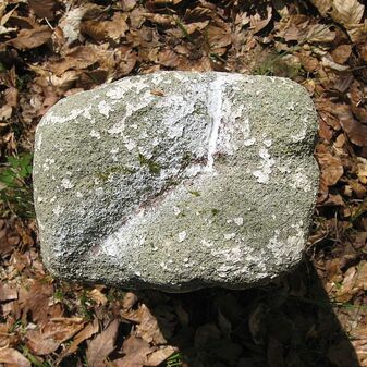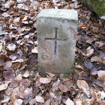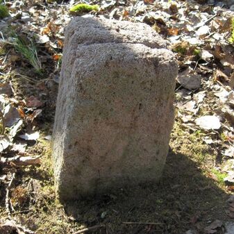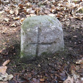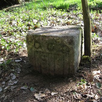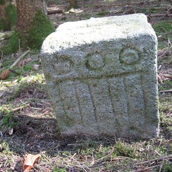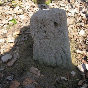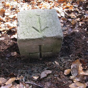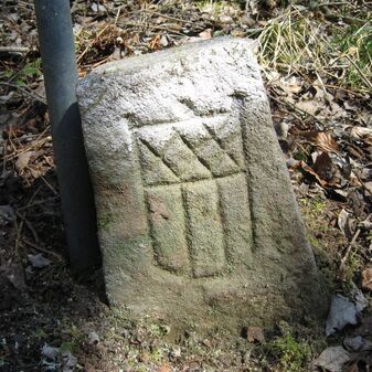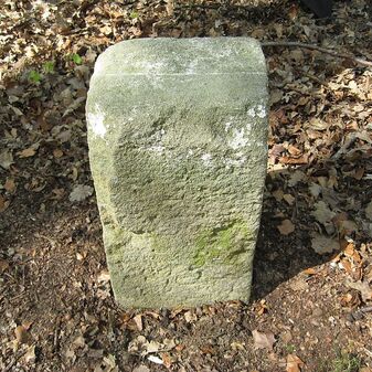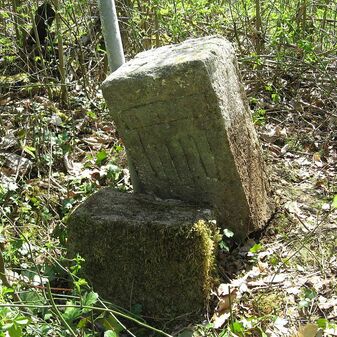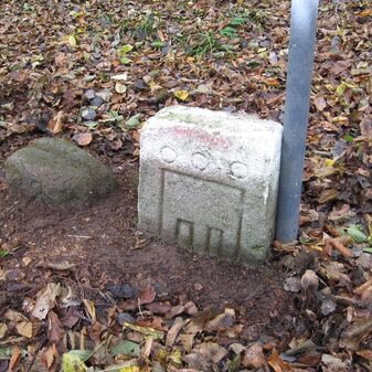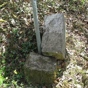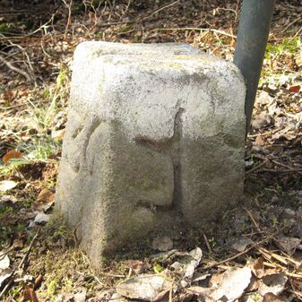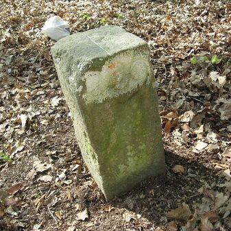 Gemarkungsgrenzstein auf aktuellem Grenzverlauf Böblingen / Dagersheim; Sandstein, rechteckige Grundform, gewölbter (wohl ehem. flacher) Kopf; stark beschädigt, 38cm hoch, 28cm breit, 25cm tief. Kennzeichnung auf den Seiten Symbol (Wappen von Böblingen) und Nummerierung (323).