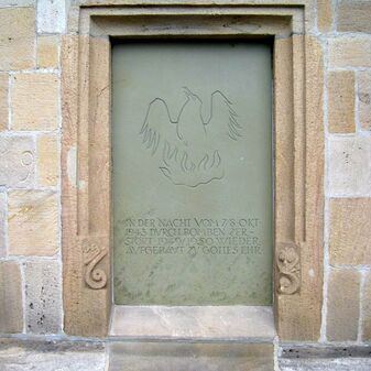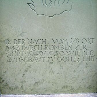 IN DER NACHT VOM 7./8. OKT. / 1943 DURCH BOMBEN ZER- / STÖRT 1949 /1950 WIEDER / AUFGEBAUT ZU GOTTES EHR
