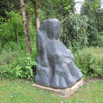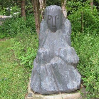 Freiplastik „Die Sinnende“ von 1974. Dargestellt ist eine nachdenkliche, sitzende Frauengestalt. Entwurf von Rudolf Christian Baisch, Bildhauer (geboren am 20. Oktober 1903 in Böblingen, gestorben am 14. Dezember 1990 in Mettmann). Gut erhalten, 180cm hoch, 100cm breit und 50cm tief, mit Inschrifttafel.