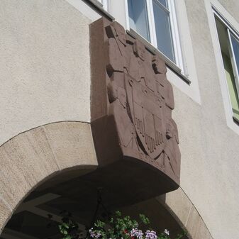 Bauornament im Scheitelpunkt eines Bogens an der Rathausfassade, bestehend aus dem Böblinger Wappen und fünf begleitenden Personen (Handwerker) mit Attributen wie Sense, Hammer, Zirkel, etc. und Inschrift, die sich auf die Bauzeit des Rathauses bezieht. Die Bauarbeiten wurden im Februar 1951 begonnen, am 24. August wurde Richtfest gefeiert. Am 7. Juni erfolgte die feierliche Einweihung. Dieser Schlussstein über dem Torbogen wurde 1953 von Helmut Uhrig (Bildhauer, 1906 - 1979) gesetzt. Gut erhalten, Buntsandstein.