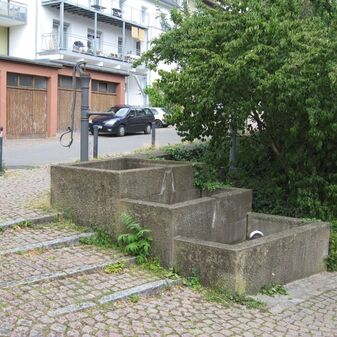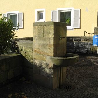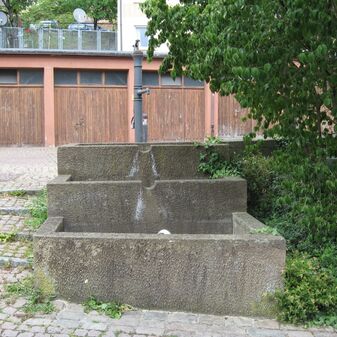 Laufbrunnen von 1986 aus Sandstein mit halbrundem Becken am gemauerten Brunnstock, aus dem ein schlichtes Metallrohr als Zulauf dient. Unter dem Brunnentrog fließt das Wasser in eine Rinne. Entwurf von Eckart Hörmann (Dipl. Ing. der Firma archiplan); im Zuge der Neugestaltung der Fußgängerzone gefertigt, zusammen mit Sitzgelegenheiten. Gut erhalten, 160cm hoch, 60cm breit und tief, läuft laut Erfasser nicht.
