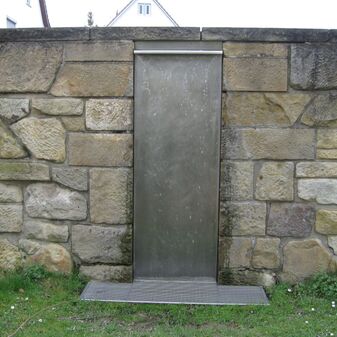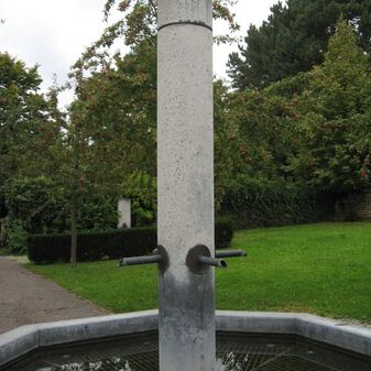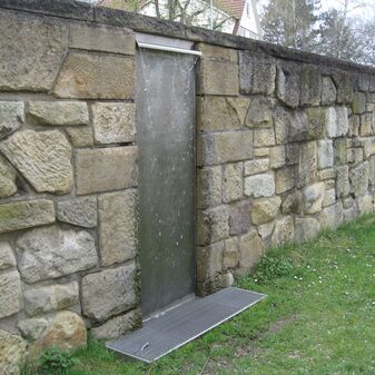 Laufbrunnen in der Steinwand eingelassen, bestehend aus einer Metallplatte. Das Wasser kommt von oben aus einer Rinne und fließt die Wand entlang nach unten. Entworfen von Klaus Begasse; 1996 aufgestellt. Gut erhalten, 225cm hoch, 80cm breit.