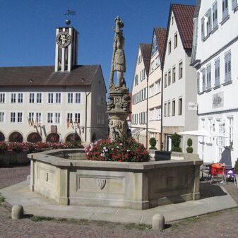 Laufbrunnen „Stadtbrunnen“ mit achteckigem Trog, zentralem Brunnenstock mit Skulptur des Hl. Christophorus, vier Ausgüsse. Es handelt sich um eine Nachbildung aus dem Jahr 1989 von Norbert Beck, Bildhauer aus Schönaich. Das Original von 1526 befindet sich in der Zehntscheuer (renoviert 1738 und im 20. Jh.). Sehr gut erhalten, Sandstein, 1,05cm hoch, 2m breit (Seiten), Brunnenstock höher. Verzierungen, Wappen und Inschrifttafel.