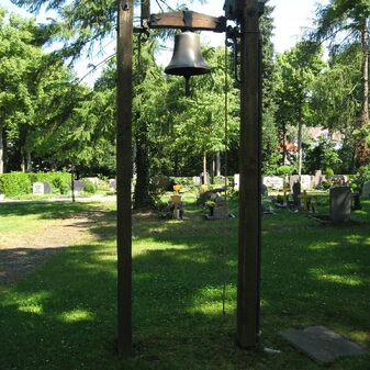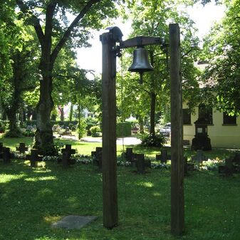 Glocke „Totenglocke“ von 1952, bestehend aus zwei 2m hohen Holzpfosten, zwischen denen die Metallglocke angebracht ist, 113cm breit, gut erhalten, mit Inschrift