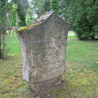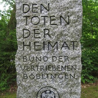 Stein zum Gedenken an die Toten der Heimatvertriebenen, aufgestellt am 2.11.2009, bestehend aus zwei Stelen aus böhmischem Granit mit Inschrift und Wappen des Bundes der Vertriebenen und der Stadt Böblingen. Sehr gut erhalten, 180 und 200cm hoch, 30cm breit und tief.