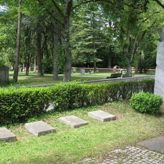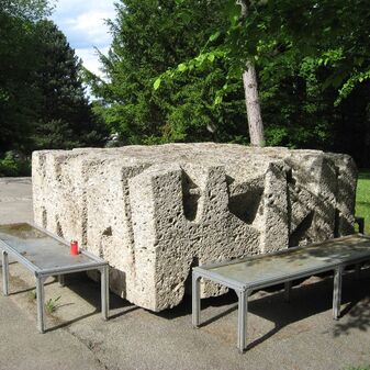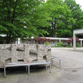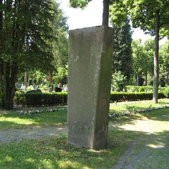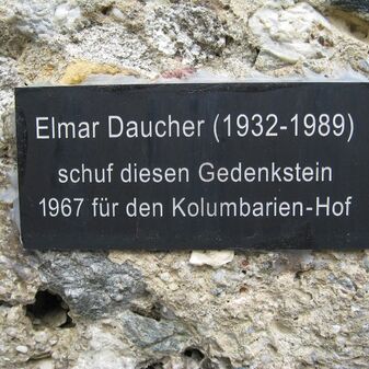 Gedenkstein von 1967 für den Hof des Kolumbariums, von Elmar Daucher, Bildhauer (geboren am 13. August 1932 in Neuenburg am Rhein, gestorben am 25. August 1989 in Oggelshausen). Quadratischer Steinblock mit Ornamenten behauen, mit Inschrifttafel. Gut erhalten, 100cm hoch, 200cm breit und tief.