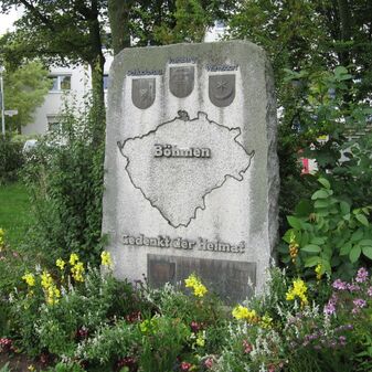 Gedenkstein von 1981 aus Stein für die Vertriebenen aus Böhmen. 3 Bronzeplatten mit den Wappen der Orte Schluckenau, Rumburg und Warnsdorf sowie einer Inschrift und Landkarte. Gut erhalten, 220cm hoch, 140cm breit, 35cm tief.
