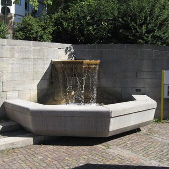 Laufbrunnen von 1986 bestehend aus drei übereinander gestaffelten Steinzylindern, die nach oben hin schmaler werden. Das Wasser fließt über zwei Rinnen von oben nach unten. Gut erhalten, 132cm hoch und mit einem Durchmesser von 3m. Von Eckart Hörmann (Dipl. Ing. der Firma archiplan) im Zuge der Neugestaltung der Fußgängerzone entworfen. Inschrifttafel.