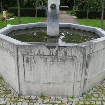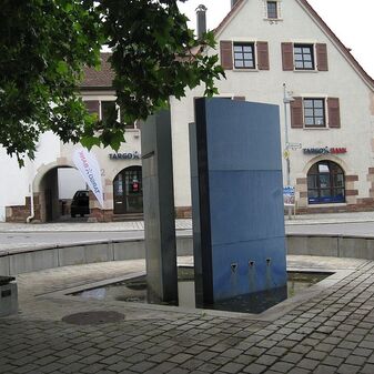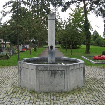 Laufbrunnen von 1999 bestehend aus drei breiten Stelen, an denen das Wasser herunterläuft und in ein quadratisches bodentiefes Becken fließt; umgeben von einer halbrunden Bank aus Beton und Holz. Das Wasser fließt jeweils aus drei dreieckigen Öffnungen, die unterschiedlich hoch angebracht sind. Gestaltet von Jörg Stötzer, Architekt aus Freiburg. Gut erhalten, aus Kunststein, mit Inschrifttafel.