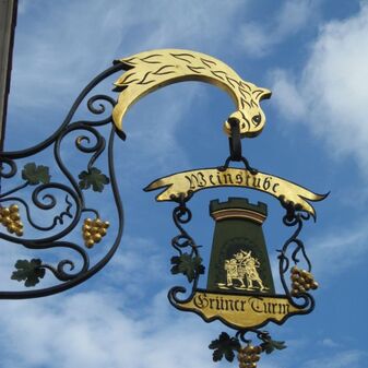 Aushängeschild der Gaststätte „Grüner Turm“ ; aus Metall, z.T. bemalt und vergoldet. Im Schild ist ein grüner Turm mit Inschrift, Weintrauben und Weinblättern dargestellt, der Arm ist ebenfalls mit Ranken, Trauben und einem Adlerkopf verziert. Das Gebäude stammt aus dem 16. Jahrhundert und wurde in den 1980er Jahren saniert.