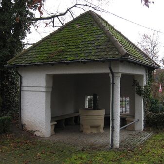 Laufbrunnen in einem offenen Brunnenhaus mit Bank von 1913/14 unter Eberle (Stadtbaumeister), gestiftet von Paul Lechler (Unternehmer) aus Böblingen, Künstler unbekannt. Brunnenstock mit Ausguss aus Metall, runder Brunnentrog aus Stein, nach unten verjüngt mit angedeuteten Füßen. Gut erhalten, 85cm hoch, 100cm Durchmesser.