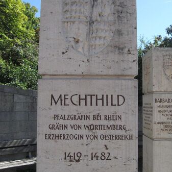 "MECHTHILD / PFALZGRÄFIN BEI RHEIN / GRÄFIN VON WÜRTTEMBERG / ERZHERZOGIN VON OESTERREICH / 1419 – 1482 // FRAUW MECHTHILD / HAT FÜR ALLE FÜRSTIN / DES TEUTSCHLANDS, / SO DISER ZEIT GELEPT, / DISEN RUM, EER UND LOB / HINDER IER VERLASSEN; / DASS DURCH IHR ANSTIFFTEN UND FÜRDERN // HERTZOG ALBRECHT VON OSTERREICH / IER GEMACHEL, / DIE HOCH SCHUL ZU FREIBURG / ANNO 1457 GESTIFFT, / DESGLEICHEN / DIE HOCH SCHUL ZU TUBINGEN / DURCH GRAFF EBERHART, / IERN SUN, DEN BARDTHERRN ZUGENANT, / ANNO 1477 AUFGERICHT IST WORDEN, // UM WELCHER BAIDER SACHEN WILLEN / SIE ALS EIN HOCHVERSTENDIGE FRAUW / VON ALLEN LIEBHABERN GUTER KÜNSTEN / BILLICH ZU LOBEN UND / SO LANG SOLCHE KUENSTEN / IM SCHWANCK GANGEN, / SIE ZU RIEMEN UND ZU PREISEN / BAIDER SCHULEN STUDENTEN / NITT UNDERLASSEN SOLLEN / SEBASTIAN KÜNG 1554 // BARBARA GONZAGA / MARKGRÄFIN VON MANTUA / GRÄFIN UND ERSTE HERZOGIN / VON WÜRTTEMBERG/ / 1455 - 1503 / GEMAHLIN DES GRAFEN UND HERZOGS / EBERHARD IM BART / VON WÜRTTEMBERG / 1445 - 1496 // SEIN GEMACHEL IST / GEWESEN FRAU BARBARA / EIN THOCHTER MARCKGRAFF / LUDOWIGS VON MANTUA / UND FRAU BARBARE / MARCKGRAFF HANSEN / VON BRANDENBURG THOCHTER // SIE IST DAS ALLERHAUSLICHST WEIB / GEWESEN SO MAN ZU IERER ZEIT / HATT FINDEN MEGEN MITT VICHZIEHEN / IERN AINIGEN LUST UND FRÖD GEHAPT / DARUM SIE AUCH DAS MERERTHAIL / ZU WALTENBUCH BEI IEREM VICH / HAUSGEHALTEN // UND IN IEREM ALTER ZU / UNGEWONLICHER GROSSE GERATTEN / DESHALB SIE AUCH ZU BEBLINGEN / UFF IER MORGENGAB GESTORBEN / UND GEN KIRCHEN / IN DAS FRAUWENCLOSTER / BEGRABEN WORDEN / SEBASTIAN KÜNG 1554 // // BARBARA GONZAGA / MARKGRÄFIN VON MANTUA / GRÄFIN UND ERSTE HERZOGIN / VON WÜRTTEMBERG / 1455 - 1503 / GEMAHLIN DES GRAFEN UND HERZOGS / EBERHARD IM BART / VON WÜRTTEMBER / 1445 - 1496 // "