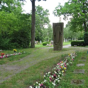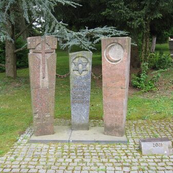 Gedenkstätte aus dem Jahr 2003 als Friedensmahnmal, nahe der Aussegnungshalle, bestehend aus drei Stelen aus unterschiedlichem Stein mit Inschrift und religiösen Symbolen (Kreuz für Christentum, Stern für Judentum und Halbmond für Islam) sowie einer verbindenden Kette. Davor kleines Podest mit Inschrifttafel. Gut erhalten, 200cm hoch, 200cm breit, 50cm tief. Dauerleihgabe von Alfred Zellner aus Sindelfingen.