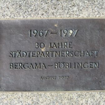 Gedenktafel von 1997 anlässlich des 30-jährigen Jubiläums der Städtepartnerschaft Böblingens mit Bergama. Bronzetafel mit Inschrift auf Granitsockel. Gut erhalten, 75cm tief, 80cm breit, in den Boden eingelassen.