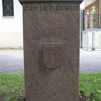 Gedenkstein von 1962 für die Verstorbenen der Chorvereinigung Liederkranz Böblingen aus Stein mit Inschrift und Symbol Lyra, oben spitz. Gut erhalten, 110cm hoch, 85cm breit, 18cm tief.