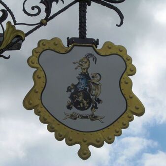 Aushängeschild am Wirtshaus „Zum Reussenstein“ von 1987 bestehend aus einem bemalten Metallschild mit dem Wappen der Familie Böckle und einem Metallarm, der mit Ranken verziert und z.T. vergoldet ist. Sehr gut erhalten. Familie Böckle führt das Restaurant seit Generationen und stammt aus der Nähe von Horb, nachweisbar bis ins 13. Jh. Im Wappen ist ein springender Bock dargestellt.