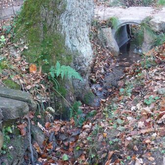Brücke aus Schilfsandsteinquadern, gemauert und mit kreisrundem Rohr. Gut erhalten, 2,5m hoch, 3m breit, 6m tief.
