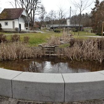 Laufbrunnen „Friedhofsbrunnen“, bestehend aus einem kreisrundes Becken aus Stein. Die Wasserführung soll die siebenjährigen Entwicklungsphasen des Lebenslaufes symbolisieren. Durchmesser 8m. Sehr gut erhalten.