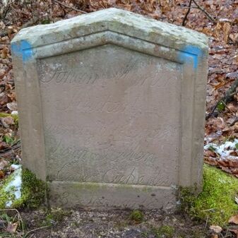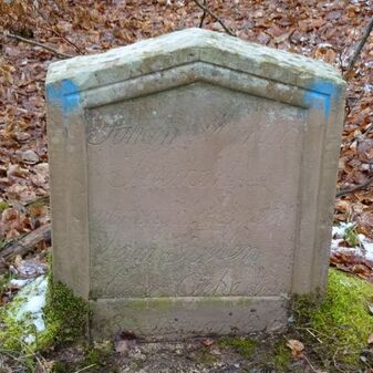 Sandstein, rechteckige Grundform, spitzer Abschluss, Inschrift. Befriedigend erhalten, 78cm hoch, 65cm breit, 13cm tief.