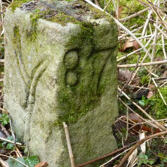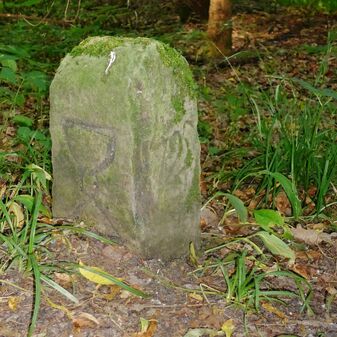 Grenzstein aus Sandstein, rechteckige Grundform, flacher Kopf; gut erhalten. Kennzeichnung an den Seiten mit Symbol (Hirschgeweih) und Nummerierung (87).