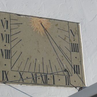 Sonnenuhr an der Kirchenfassade; bestehend aus Sandstein mit Metallstab und eingravierten römischen Zahlen und dem kolorierten Symbol einer Sonne. Funktionsfähig, sehr gut erhalten, 1m hoch und breit.