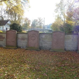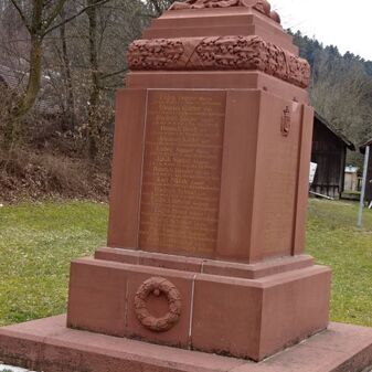 Gefallenendenkmal für die Gefallenen und Vermissten der beiden Weltkriege. An der Friedhofsmauer befinden sich fünf rechteckige Sandsteinplatten mit spitzem Abschluss und Inschriften zu den Verstorbenen des Zweiten Weltkriegs. Davor befindet sich ein freistehendes Sandsteindenkmal mit Eichenlaubkranz und Helm sowie Inschriften zu den Verstorbenen des Ersten Weltkriegs. Dieser Teil des Denkmals wurde 1928 errichtet - nach Gemeinderatsbeschluss im Jahr 1921 - und 1953 durch die Sandsteinplatten ergänzt. Gut erhalten.