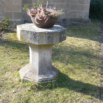 Ehem. Taufstein aus Schilfsandstein, achteckig mit Fuß und flachem Tisch. Sehr gut erhalten, 1m hoch, 70cm tief und breit.
