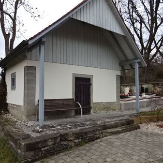 Andachtsstätte „Leichenhaus“, genutzt zur Aufbahrung der Toten, falls dies nicht zu Hause geschah. Erdgeschoss mit Sandsteinquadern und verputzter Fassade sowie Holztür und kleine Fenster. Dachgeschoss aus Holz mit Satteldach. Sehr gut erhalten, 6m hoch, 4,8m breit, 3m tief.