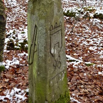 Grenzstein aus Sandstein, rechteckige Grundform, gewölbter Kopf; gut erhalten. Kennzeichnung an den Seiten mit Symbolen (zwei Ringe, stilisierte Lilie für Kuppingen) und Nummerierung (1 5).