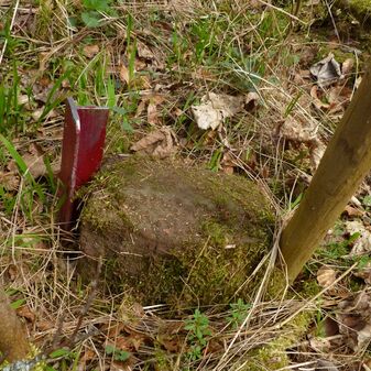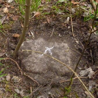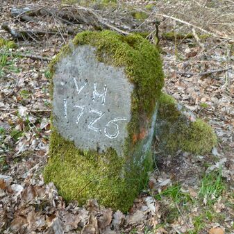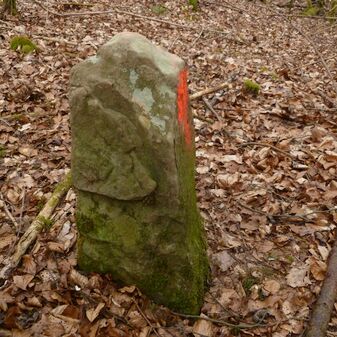 Grenzstein, Dreimärker; nicht mehr am urspr. Standort. Rechteckige Grundform, Stein, flacher Kopf mit y-förmiger Krinne, an den Seiten Buchstaben (V, R), Symbol (Hirschstange) und Nummerierungen (55, 2, 3). Befriedigend erhalten, 45cm hoch, 23cm breit, 22,5cm tief.