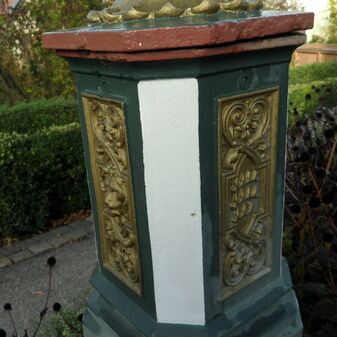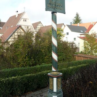 Oberamtstafel aus Gusseisen mit kolorierter Inschrift; errichtet 1863. Befriedigend erhalten. 275cm hoch, 51cm breit, renoviert um 1980.