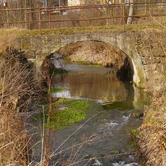 Brücke aus Kalksteinblöcken, halbrund über die Irm. Sehr gut erhalten, ca. 3m hoch, 3m breit und 4mtief