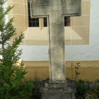 Sockel des Grabkreuzes des Schultheißen Johannes Butz; bestehend aus rotem Sandsteinen, gemauert, mit weißer Inschriftentafel. Mangelhaft erhalten, 121cm hoch, 65cm breit, 54cm tief. Früher soll sich obenauf ein Kreuz befunden haben, das heute fehlt.