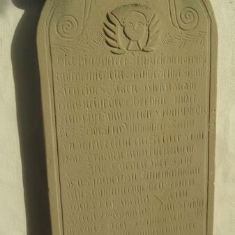 Epitaph für den Pfarrer Gottfried Adam Speidel, angebracht an der Fassade der Kirche. Gelber Sandstein, halbrunder Abschluss mit Verzierungen und Kopfrelief, darunter Inschrift. Befriedigend erhalten, 185cm hoch, 70cm breit, 10cm tief. Weitere Informationen vorhanden.
