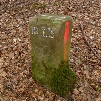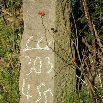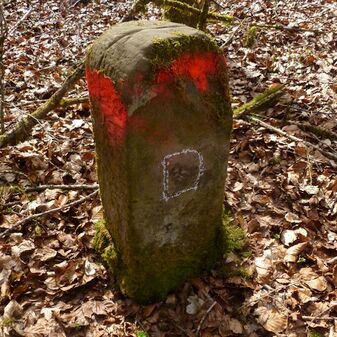 Grenzstein, nicht mehr am urspr. Standort. Rechteckige Grundform, Stein, flacher Kopf mit gekrümmter Krinne, an den Seiten Symbol (Hirschstange) und Nummerierungen (303, 455). Befriedigend erhalten, 70cm hoch, 23cm breit, 24cm tief.