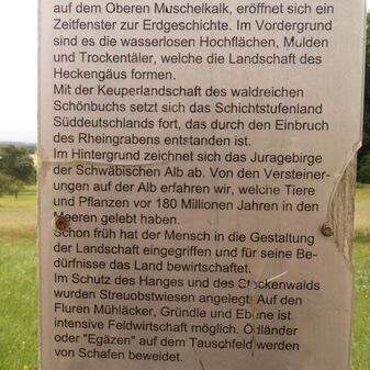 „Landschaftsfenster Steinenbühl“, bestehend aus Holzpfosten und Holzbalken und kleinem Schild mit Informationen zu Steinenbühl. Gut erhalten, 3,15m hoch, 180cm breit.