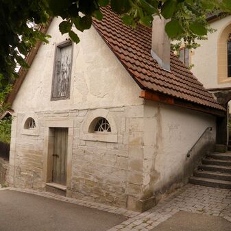 Zugemauerter Rundbogen. Gut erhalten. Laut Erfasser ehem. Toreingang zur Deufringer Kirche.
