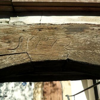 Bauinschrift am Türsturz mit Jahreszahl 1772. Mangelhaft erhalten, ca. 16cm hoch und 25cm breit; Eichenholz.