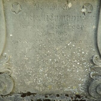 Christus ist unser Friede / Hier ruhen / Victor Hermann / Pfarrer von Deufringen / 1896-1916 / geboren 4. Febr. 1866 / heimgegangen / 19. Nov. 1916 / und seine treue Frau / Amalie Hermann / geb. Meurer / geboren 4. März 1869 / gestorben 15. Sept. 1918