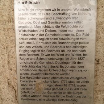 Unterstand für Feldschützen, „Harthäusle“; errichtet 1827 und bestehend aus Stein, Holz und Ziegeln. Befriedigend erhalten, ca. 3,9m hoch, 4,8m breit, 5,2mtief. In der Nähe befindet sich eine Infotafel.