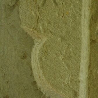 Hausmarken von 1592, verschiedene Steinmetzzeichen im gelben Sandstein. Befriedigend erhalten.