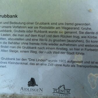 Ruhebank von 1905, bestehend aus zwei senkrechten und zwei waagrechten Steinplatten und einer Inschrift. Befriedigend erhalten, ca. 1,5m hoch, 2,3m breit, 40cm tief.