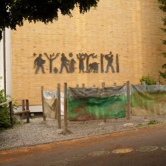 Wandbild „Vier Jahreszeiten“; geschaffen 1964 vom Künstler Joachim Müller-Gräfe und bestehend aus Silhouetten von Bauern bei der Arbeit (Säen, Ernten, Fällen). Gut erhalten.