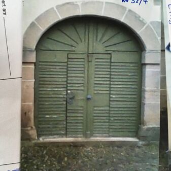 Portal aus Sandsteinquadern mit Gesims und halbrundem Fenster sowie Eichenholztüre; erbaut ca. beginnendes 19. Jahrhundert, saniert. Gut erhalten, ca. 3m hoch, 2m breit.