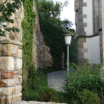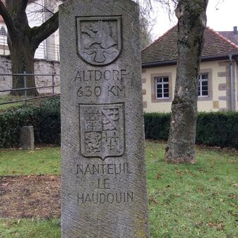 Entfernungsstein und Gedenkstein, der an die 630 km entfernte französische Partnerstadt Nanteuil-le-Haudouin erinnert, gesetzt 1991, Stein, rechteckige Grundform, flacher Kopf, gut erhalten, gerade stehend, 1,35m hoch, 40cm breit, 25cm tief, Inschrift und die beiden Stadtwappen.