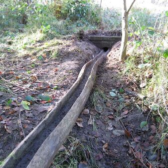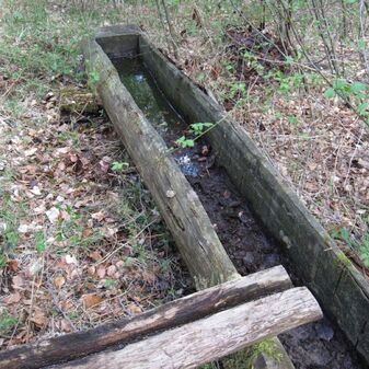 „Kapellenbrunnen“, Brunnenstube aus gemauerten Steinen und Holzrinne mit Trog aus Baumstämmen; 1974 von Albert Kächele (Revierförster von Altdorf, 1967 - 2000) angelegt; Holztrog aus Lärche mit Rinne, sehr verwittert, 4,60mlang, 50cm breit, Zulauf 5m lang. Urspr. Quelle für die nahegelegene Kapelle und Klause von Bebenhäuser Mönchen (13. - 15. Jahrhundert); 1999 nach dem Orkan Lothar trockengefallen. Dabei wird sich vermutlich der Wasserzug einen neuen Ausgang direkt unterhalb der Reste der Kapelle gesucht haben.