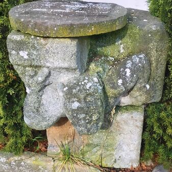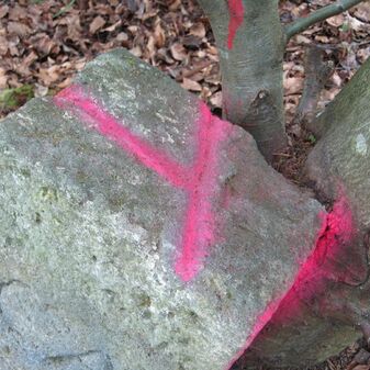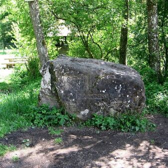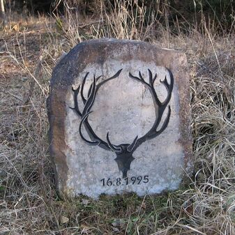 „Kächelestein“, Gedenkstein von 1997 für Albert Kächele , der hier 1995 zum Abschied einen Hirsch (18-Ender) schoss. Sandstein, gewölbter Kopf, gerade stehend, gut erhalten, 95cm hoch, 83cm breit, 18cm tief, gestaltet von Hannes Reuter, Zivildienstleistender aus Bad Urach, mit Datum und Symbol (Geweih).