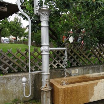 Pumpbrunnen aus Gusseisen aus dem 19. Jahrhundert, verzierter, polygonaler Pumpenstock, langer, geschwungener Pumphebel, steht noch auf der Brunnenstube, gut erhalten, heute während der frostfreien Zeit ein Laufbrunnen. Wasser fließt aus dem schlichten Ausguss in einen steinernen Brunnentrog.